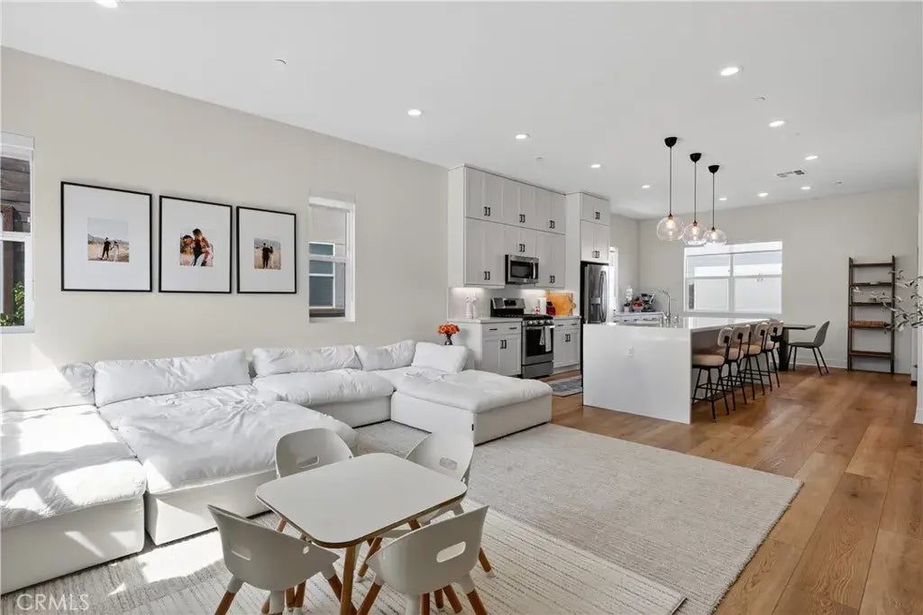 Perched in Anaheims Platinum Triangle with premium pool views, this 2021-built end-unit home features 4 bedrooms, 3.5 bathrooms, and 2,160 sqft of bright, thoughtfully designed living space. From the rooftop deck to the gourmet kitchen, every detail has been crafted for modern comfort, entertaining, and effortless living. The entry level features a private bedroom with a full ensuite bath, ideal for guests or multigenerational living. The second floor is the heart of the home, where an expansive great room is bathed in natural light from walls of windows and soaring ceilings accentuated by recessed lighting. The gourmet kitchen is a chefs dream, with ceiling-height shaker cabinetry, a waterfall-edge quartz island with bar seating, quartz backsplash, ceramic farmhouse sink, and a spacious pantry. A bright breakfast nook, powder room, and indoor laundry closet complete this level. Upstairs, the primary suite is a serene retreat, featuring dual sinks, upgraded porcelain tile flooring, a subway-tiled shower, and a large walk-in closet. Two additional well-sized bedrooms share a beautifully appointed hallway bath. The fourth-floor rooftop deck is the ultimate entertainers dream - perfect for hosting friends, relaxing with family, or enjoying panoramic city views and Disneyland fireworks. Thoughtful upgrades elevate every level of the home, including LVP flooring on the main floor, roller blinds throughout, solar-ready rooftop, a water filtration/softening system in the kitchen, and strategically placed outlets for wall-mounted devices. A 2-car garage with EV charging and side st