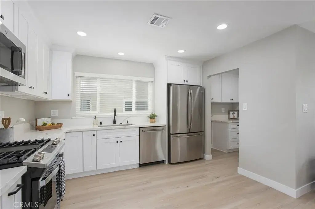 This stunning single-story home offers 3 bedrooms, 2 bathrooms, and 1,242 sqft of fully renovated living space! Step inside and youll immediately notice the sleek wood laminate flooring, and numerous upgrades throughout. The spacious living room features recessed lighting and opens directly to the backyardperfect for relaxing or entertaining. Adjacent to the dining area, the modern kitchen boasts stainless steel appliances, quartz countertops, crisp white cabinetry, and a convenient indoor laundry area. The primary bedroom is generously sized and includes an en-suite bathroom with quartz counters and a shower/tub combo. Both bathrooms have been tastefully updated. Enjoy the outdoors in the large, fully enclosed backyard, complete with a 10' x 12' storage shedideal for extra storage or a hobby space. Centrally located in La Habra, Close to Costco, shopping, dining, and more. Please note: Garage is not included.