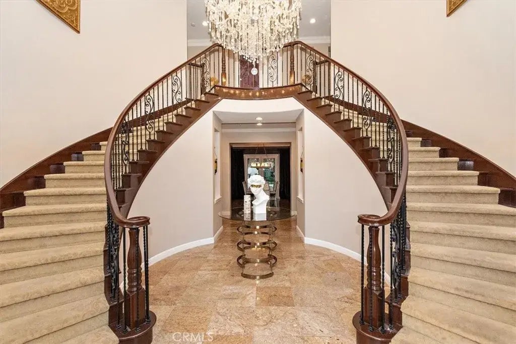 A stunning Mediterranean Resort style luxurious home located in the heart of Pinnacle Estates, spanning 5,369 sqft on a vast 33,977 sqft lot containing 5 bed/5 baths, an office room, bonus room, a 4 car garage with RV access and breathtaking backyard with a Pool & Spa. This 2004 built immaculate Santa Barbara model is unrivaled for its' ultimate and sought-after open floor plan with an exquisite decor greeted with a dramatic dual staircase set under 25 ft. grand foyer ceilings and a chandelier that will take your breath away the moment you step foot. The ground floor features an office with built-ins and a bedroom and 1 1/2 baths, while the upstairs hosts a massive primary suite with a waiting area, an en-suite bathroom with dual sinks, an additional private toilet, custom built-ins, a fireplace, his & her walk-in closets, & a luxurious balcony overlooking the sparkling pool and spa. Each bedroom enjoys its own bathroom, ensuring personal space and convenience. The heart of this home is its entertainment potential, highlighted by three large living areas, including a formal dining room and a family room that opens to the kitchen. Some distinctive amenities inc. plantation shutters/custom draperies, bamboo hardwood flooring, granite flooring, crown molding, spectacular light fixtures, a gourmet kitchen with a granite covered center island and GE Monogram appliances, walk-in-pantry & wet bar, custom built-in cabinets, water softener sys., garden house, and so much more. As you step outside, tranquility awaits you on this 0.78-acre outdoor oasis with privacy and custom landsc