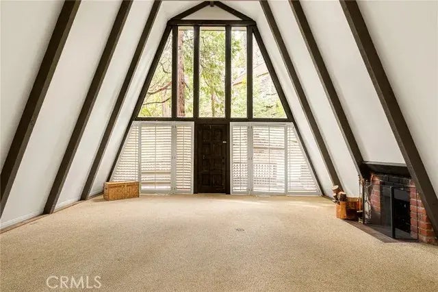 Unique mid-century modern Gambrel with lake rights nestled in an idyllic forest setting. First time on the market and beloved by the same family for over 60 years, this home evokes the "escape to the woods ambience" yet is located less than a mile from the Lake Arrowhead Village, Burnt Mill Beach Club, and the Lake Arrowhead Brewery. This distinctive mountain home has retained its original character and includes towering ceilings, soaring beams, clerestory windows, a brick fireplace, and two wood-burning stoves. The main floor includes two living areas, both with large windows that facilitate a seamless connection between indoor and outdoor spaces. The 1960's retro kitchen is charming and open with views of the blooming Dogwoods and meandering private path. The matching yellow full-sized bathroom can also be found on the first floor. There are 2 bedrooms upstairs with tree top views making for a peaceful retreat. Downstairs there is an additional room that would make a great bunk room or den plus another full-sized bathroom with laundry. Near level entry and parking make for easy access to the home, which has a feeling of seclusion, yet is so close to the amenities of Lake Arrowhead. This is a rare opportunity to own a well preserved gem in an outstanding location that feels like you are a million miles away.
