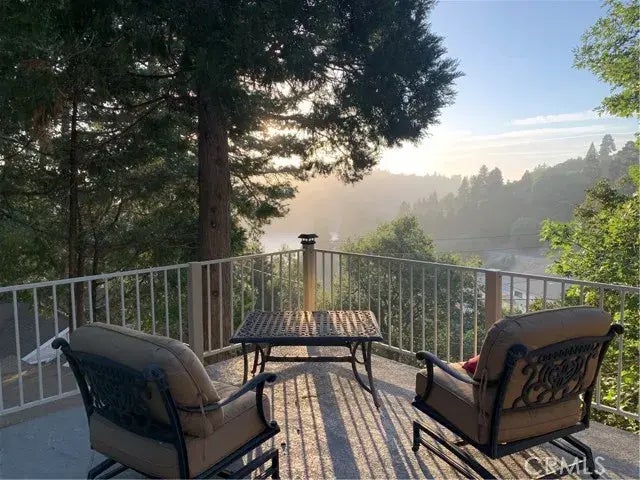Easy walk to Lake Gregory!! This lovingly maintained Lake View Beauty is located in the quiet upper portion of the highly coveted neighborhood of San Moritz Drive, and the large .33-acre lot ensures privacy and offers many choices of outdoor destinations to take in the nature that surrounds you. The oversized 3 car garage has an equally large roof top deck with peaceful views of the northern part of the lake, trees, stars, and surrounding neighborhoods, with both sun and shade throughout the day. Easy stairs lead to the wrap-around deck with even more space to BBQ, dine and entertain. The double front door entry leads into your lofted ceiling living room and kitchen. The living room is spacious yet cozy, with a nice lake view from the numerous dual paned windows, and a gorgeous gas fireplace. The well-appointed kitchen has granite countertops, beautiful cabinetry, all stainless appliances, and large center island for casual dining with plenty of extra storage and workspace. Also on this level you will find a roomy bedroom, bath with adorable decorative tiles and walk in closet. Upstairs is the large master bedroom suite, with walk in closet, high ceilings, and lots of natural light. The private bathroom has a luxurious bathtub, separate shower, dual vanity, and convenient laundry closet. Double sliding doors lead out to a covered deck, large, fenced yard for furry friends, tree house deck and fruit tree landscaped yard area. There is also a bonus room under the front deck for a small gym or private home office. This outstanding property is in beautiful condition, with updat