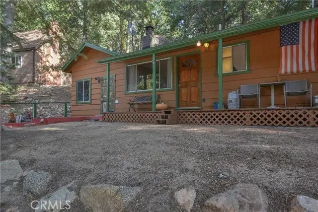 Super cute chalet style home in Running Springs - Perfect ski and year round mountain cabin iwth single level living and newer wood floors, 3 bedrooms (use one for an office?), 1 bath, Living Room & Kitchen... With adjacent Laundry & Workroom. Lots of fenced yard space with lots of potential- nice storage & wood sheds included! Although upslope from the parking area, the gradual stairs make it fairly easy to get to the front door. Enjoy year round mountain fun with an easy commute on & off the mountain, to local ski resorts, hiking trails, and all things mountain! Public records show 2 bedrooms, there is a 3rd room with a closet. Buyer to verify all information to their satisfaction.