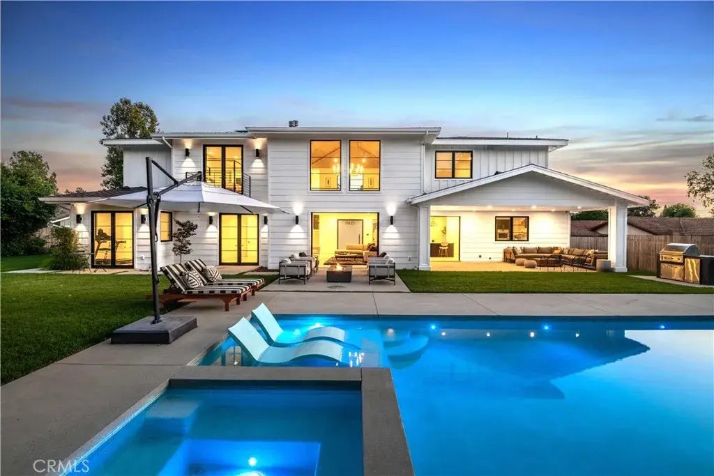 Newly completed in 2022, this sprawling Conejo Oaks estate is stunningly sophisticated and has every amenity todays discerning buyer desires. The front door sets the tone as an oversized frosted glass swivel allowing light inside but privacy from those outside. Elegance and grandeur exude the minute you enter and experience the soaring 20-foot tongue and groove ceiling in the great room. Flooded with light and very open, the first floor also showcases the kitchen which is a culinary masterpiece including Wolf appliances, Carrara marble countertops, a luxurious backsplash and ample island seating for casual dining. A spacious walk-in pantry nearby offers ample storage, even accommodating a second refrigerator. Just around the corner is a formal dining room surrounded by large windows out to the picturesque front yard. On the other side of the kitchen, you can step through the large, commercial grade pocket doors into your personal sanctuary, a daily escape to a perpetual vacation. The covered lanai invites leisurely lounging, while the heated pebble sheen pool and jacuzzi promise tranquil relaxation. The spacious half-acre flat lot is a canvas for your dreams, perfect for recreation, cultivation, and exploration. Upon re-entering the residence, on this first level you'll also find a powder room and two bedrooms, each with its ensuite bathroom. Further exploration reveals two versatile rooms that can be used as offices, media room, home gym or game room. The separate, temperature controlled wine cellar is like a piece of art itself. At the top of the generous wood plank stair