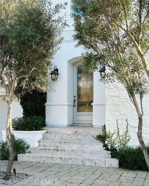 This meticulously designed Mediterranean home, offering three exquisite levels in 2989 square feet, reveals the architectural framework and details that one might expect to see in Europe. A theme of arches and exposed, reclaimed beams provide timeless elegance throughout this four-bedroom, three-and-a-half bath residence. With a minimal canvas in mind, bleached wide-plank Douglas Fir floors and limestone provide warmth, texture, and sophistication, while stunning venetian plaster walls reflect natural light. The sundrenched ground floor is appointed with a cozy office/media room, including a fireplace and west-facing French doors. The adjoining en suite bedroom is fitted with custom storage and affords charming views of the mature olive trees. A noteworthy laundry room provides ample storage and a custom sculptural travertine stone sink. The open-air travertine staircase connects you to a spacious mid-level foyer adorned with archways that lead to the private sleeping quarters. Two bedrooms have integrated storage, shelving, and a built-in travertine desk surface; the Jack-and-Jill bath offers custom brass fixtures and a venetian plaster shower and barrel ceiling. The primary suite includes a cozy fireplace, seating area, and integrated wardrobe storage, while the bathroom features a walnut and soapstone double sink vanity, enclosed toilet, and a barreled ceiling walk-in shower. On the third floor, the custom kitchen overlooks the Pacific and allows access between two balconies. The bespoke walnut island provides 24' linear feet of concealed storage and kitchen electronics