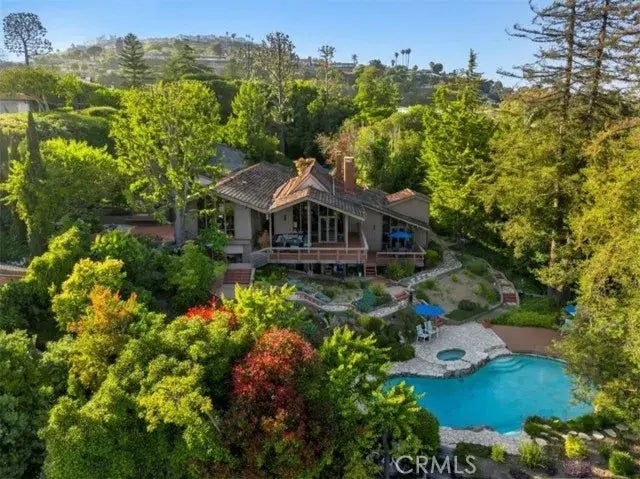 Designed by architect Paul Wuesthoff, this Mid-Century Modern retreat feels like your own private mountain resort. Nestled into an acre of very usable land, the design and layout will impress the most discerning Midmod enthusiasts, while the breathtaking views from the harbor to Catalina will have everyone else amazed. As you open the gorgeous custom front door, you are taken back into a time when architectural design was unique and artistic. The dramatic entry leads to a library with wall-to-wall built-ins and a private nook, as well as the Great Room, featuring cathedral ceilings and floor-to-ceiling windows, and an attached deck that gives you the best of indoor/outdoor living. The dining room enjoys the same panoramic views and connects to the large, refreshed kitchen with quartz countertops, a Zellige Crema tile backsplash, and recessed lighting. The Primary Suite has a newly remodeled bathroom with limestone floors, Isola Capri tile, Kohler fixtures, West Elm hardware, a walk-in shower, and a freestanding tub. There is a spacious walk-in closet and another large closet, making the battles of closet space a thing of the past. The primary bedroom has raised ceilings and French doors that open to another private deck that would be amazing for morning coffee or yoga (or both). On the lower level is a large lounge/den with a fireplace and wet bar that is perfect for when you want more space for your guests. This level has the other three bedrooms and provides an option to open two into one large room. The second bathroom has been completely remodeled with limestone floorin