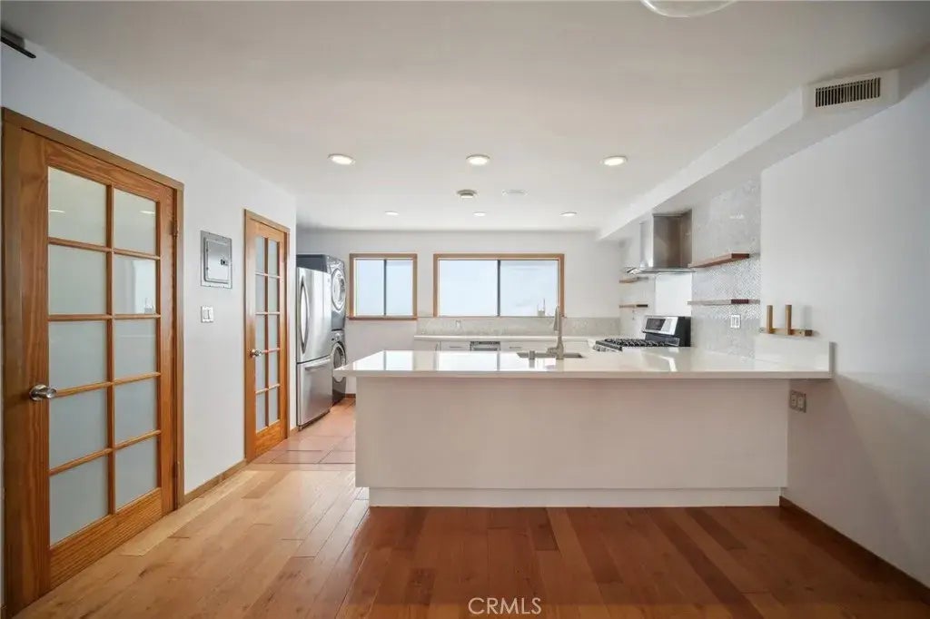 Welcome to this nicely located Mar Vista 2-bedroom, 2.5-bathroom town-home style condo residence, boasting 1,087 sq. ft. of thoughtfully designed living space. This home offers a perfect blend of comfort, style, and convenience, making it an ideal choice for modern living. Step inside to discover beautiful hardwood floors that flow seamlessly throughout the main living areas. The open-concept layout features the living room area that extends to a charming front patio, ideal for enjoying your morning coffee or an evening breeze. The kitchen features quartz countertops, custom soft-close cabinets, and a stylish tile backsplash. It comes equipped with stainless steel appliances, including a stove, dishwasher, wine fridge, and refrigerator. A convenient stackable washer and dryer are neatly tucked away in the kitchen area. The space is further enhanced by floating shelves and recessed lighting, creating a bright and inviting atmosphere. Also on the first floor, you'll find a practical half bathroom/powder room and extra storage space underneath the stairs. Upstairs, the secondary bedroom offers hardwood floors, a walk-in closet, and an en-suite 3/4 bathroom with contemporary fixtures and flooring. The primary bedroom is a true retreat, featuring custom sliding closet doors, organizers, and a vaulted ceiling. Enjoy a private balcony accessed through glass sliding doors, perfect for unwinding. The en-suite bathroom features a full bath, a tile backsplash shower, a modern vanity, and a floating shelf. This residence is located in the desirable Mar Vista community with easy access