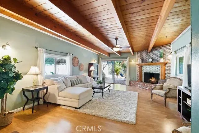 This quaint 3 bedroom home is located on a great street lined with other single family residences. Lush landscaping welcomes you to the entrance. Prepare to be captivated by the spacious family room, where a stunning wood-beamed ceiling and a cozy brick fireplace create a warm and welcoming atmosphere. The family room seamlessly flows into a large dining room, perfect for hosting gatherings with friends and family. Positioned off the dining room is the bright kitchen that offers access to the backyard, painted brick accent walls and newer luxury vinyl plank flooring. Enjoy the California lifestyle with cherry, fig and banana trees and a covered, brick patio off the family room, great for outdoor dining and relaxation. The spacious front and back yards offer ample space for gardening, play, or simply unwinding in your private oasis. Additional highlights include wood flooring, crown molding, dual-paned windows for energy efficiency, ceiling fans in the bedrooms and a detached garage. The location and easy access to the 110 freeway, supermarkets, Target, LA Fitness, etc. are a convenient added bonus! The neighborhood is known for its lovely neighbors and strong sense of community, making it a truly special place to live. Don't miss the opportunity to make this special home your own.