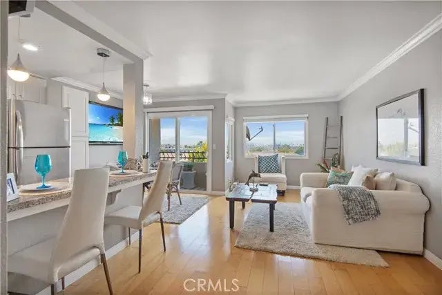 Located in the desirable Vista Del Oro neighborhood in San Pedro, this adorable unit is well upgraded with quality and style and has a sweeping views of Long Beach Harbor and the ocean! Located well in a corner of the upper level, this unit is open and filled with natural lights and offers a quiet and private lifestyle. Through the large sliding door in the dining area, there is a cozy deck overlooking sweeping Long Beach Harbor and ocean views at day and sparkling lights at night! The intensive upgrades include: The kitchen with granite countertops, bars and stainless-steel appliances and recess lightings, a bathroom with granite countertop and a beautiful under mount sink, maple wood flooring, smooth ceiling and lightings with fan and so on. A washer and dryer closet by the bathroom and additional cabinets providing ample storage. This unit comes with an assigned parking spot in a secured parking garage with an automatic gate. Vista Del Oro neighborhood is just a blocks away from San Pedro Fish Market and the ocean side, easy access to 110 Freeway and Long Beach and Palos Verdes. Come and see this "Must See" unit that hardly comes by.