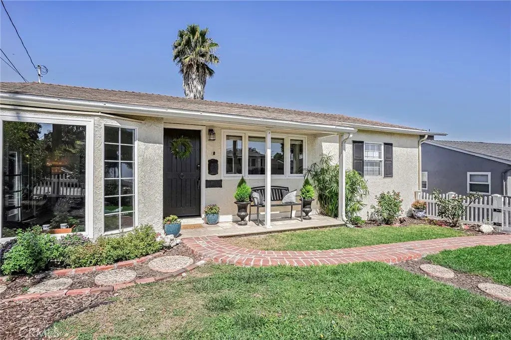 PRICE REDUCED! Sweeping views. Mid-century aesthetic. Mature fruit trees . . . All the magic of Palos Verdes wrapped up in a pint-sized property. Peep through the picture window, enter the white picket-fenced rose bush-filled front yard and pass the inviting bench on the covered porch. Open your front door to be greeted by sweeping views of the South Bay. Follow the view to an expansive (450+ sf) deck conveniently located adjacent to the kitchen, providing ample private space for entertaining amidst the treetops and chirping birds. Inside, upgraded wood floors gleam in the living room, while the carpeted bonus area invites cozy relaxation. A privacy curtain easily converts this large space to a third sleeping area for visiting guests. Relax with morning coffee and rest your eyes on the attractively landscaped front yard garden in the picture-perfect bay window. Sliding glass doors showcase the trickling fountain. The galley kitchen further embraces the view while providing convenient space for family meals. Ready to party? Set up the bar in the kitchen and your guests will easily flow through to the deck for sunset cocktails. Shiplap walls and recessed storage niches in the remodeled bathroom evoke the charm of a traditional era, while the step-in shower enables multi-generational accessibility. The 400sf (btv) garage has multiple windows that continue to leverage the view, making it an ideal space for a home office, work shop, or whatever use suits your lifestyle. While this traditional home is fully accessible at street level, the double-sized lot is gracefully terraced i