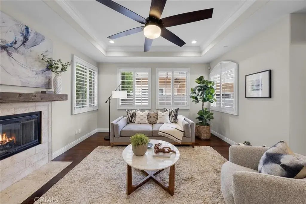 Enter through double doors to this beautifully built custom home. With just one common wall, this private residence is tucked back from this highly-desirable street, providing tranquility and privacy. Peer up at the sky-high ceilings with wide-plank wood floors under foot and experience an abundance of natural light in this open floor plan. On the main level, the fireplace anchors a well-designed space that includes the kitchen, formal dining area, living room. The kitchen has Quartz counter tops, stainless steel appliances, designer subway tile and beautiful cabinetry, as well as a secondary counter area with a wine refrigerator and an additional sink. Also on this entry level is a dedicated laundry room with additional storage and refrigerator. The private backyard with mature landscaping is easily accessed through the main living area and has both a grassy area as well as a patio for outdoor seating. Upstairs is the primary suite with a cozy fireplace, sliding doors leading to a private balcony and vaulted ceilings. This suite also includes a generous walk-in closet, beautiful herringbone patterned flooring and a bathroom that includes a deep soaking tub, dual sinks, designer tile and luxury fixtures. A family room on this upper level provides a more casual space for relaxing. With cozy carpet and high ceilings this flex area can be used as a home office as well. Three additional light and bright bedrooms on this level have vaulted ceilings, generous closet space and share a bathroom with a stone-clad tub/shower combination. The quality of this construction is apparent i