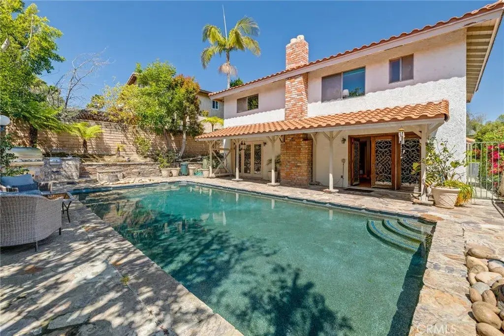 Welcome to 1836 Peninsula Verde Drive! This Spanish-style home delivers old-world charm, with gorgeous Flagstone throughout the driveway, walkways, and across the backyard, a Spanish tile roof, and STUNNING stained-glass windows and doors throughout the lower level. Just in time for the summer BBQ season!! You'll experience the ultimate indoor-outdoor experience for entertaining with a sparkling black-bottom pool, an outdoor kitchen, an expansive covered patio, a gas firepit, and lush landscaping. The built-in poolside kitchen includes a 48" rotisserie grill, a griddle, a refrigerator, a sink, and cabinet storage - all stainless steel! The main level of the home features two living spaces, with a dual-sided fireplace, a great kitchen/dining/family room for entertaining, a guest bath with a private water closet, and a 2-car garage with convenient, interior access to the kitchen. (The shortest trip for carrying groceries you've always wanted!) All 3 bedrooms are upstairs, including a lovely primary suite with a bath, a cedar-lined walk-in closet, two additional mirrored closets, and an enclosed balcony with an oversized tiled hot tub, and overhead skylights. Youll fall in love with the charm of this Rancho Palos Verdes home, with convenient access to the city, with all the amenities of the South Bay!