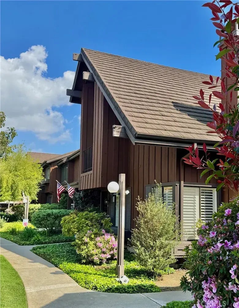 Great Value! Welcome to this lovely corner unit townhome located in the "The Gardens". This beautifully maintained 2-bedroom, 2.5-bathroom offers a perfect blend of comfort and light throughout. Entering into the spacious living room with natural light, wood flooring, white shutters, and a fireplace for relaxation. The generous dining room is wonderful for entertaining with delicious meals creating an atmosphere of laughter and joy. The kitchen includes updated stainless steel appliances, corian counters with a breakfast bar, garden window, and tile flooring. As one walks through the beautiful French doors that lead to the lush green colorful garden setting, one can imagine fun barbeques and hearing laughter. Each bedroom is a personal sanctuary, complete with en-suite bathrooms for privacy and convenience, along with both bedrooms having ample closet space - including extra large storage space. The finished two-car detached garage includes laundry facilities with several storage closets. Enjoy the resort-style living, tennis courts, sparkling swimming pool, with prime location to shopping, dining, churches, highly rated schools, and easy access to freeways. Opportunity - entertaining offers.