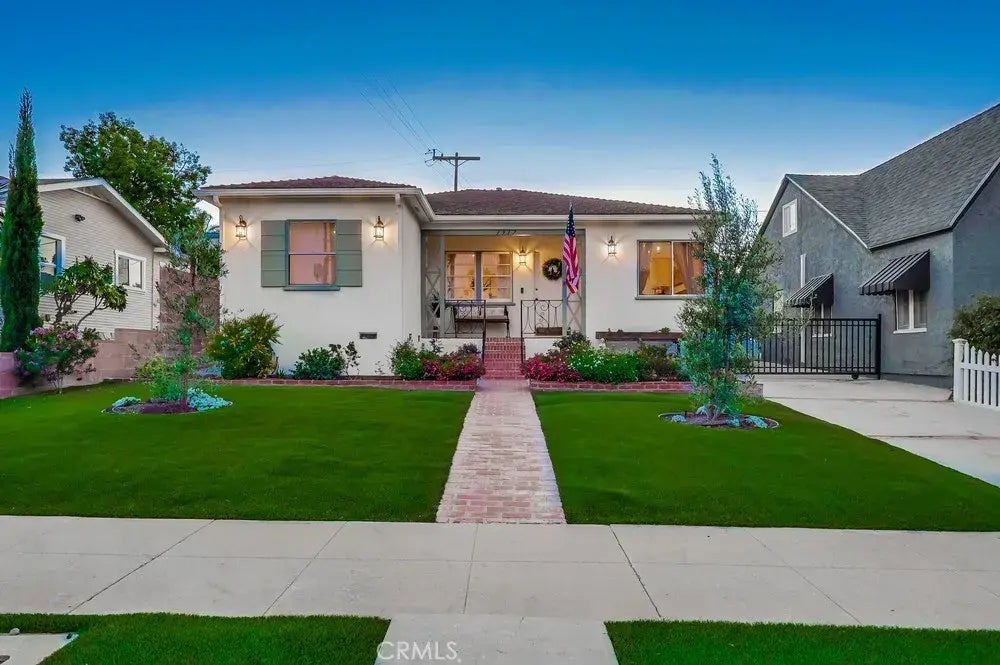 HONEY, STOP THE CAR!! That's how you'll feel when you drive by this charming 1940's cottage and it grabs you with it's amazing curb appeal. You'll be captivated by the lush green artificial turf that is framed with colorful planters and vibrant trees as you make your way to the covered front porch that is a great place to enjoy a cup of coffee before getting your day started. Upon entering through the front door into the living room you'll notice the fusion of the old and the new that creates a very bright and inviting living environment. The open design combines the living area, recently remodeled kitchen and dining nook to create an atmosphere that is both aesthetically appealing and functional. The incredible kitchen is definitely the heart of this special home and features custom cabinetry, an island with breakfast bar, cooktop and oven, stone accent wall and quartz counters. Running throughout the home is wide-plank French Oak style wood-laminate flooring that is as attractive as it is easy to maintain. The main hall leads you to the bedroom area where you'll find the two secondary bedrooms and a nicely appointed full bath with jetted tub, pedestal sink and built-in linen cabinetry. The spacious primary suite offers a 3/4 bath and a newly installed closet system. The laundry equipment has also been cleverly tucked into the 3/4 bath for convenience. The rear yard includes a covered patio with bistro lighting and a grassy area (turf) that is plenty large enough to accommodate a jumper for backyard Bday parties. There's a one car garage and driveway parking for another 3-
