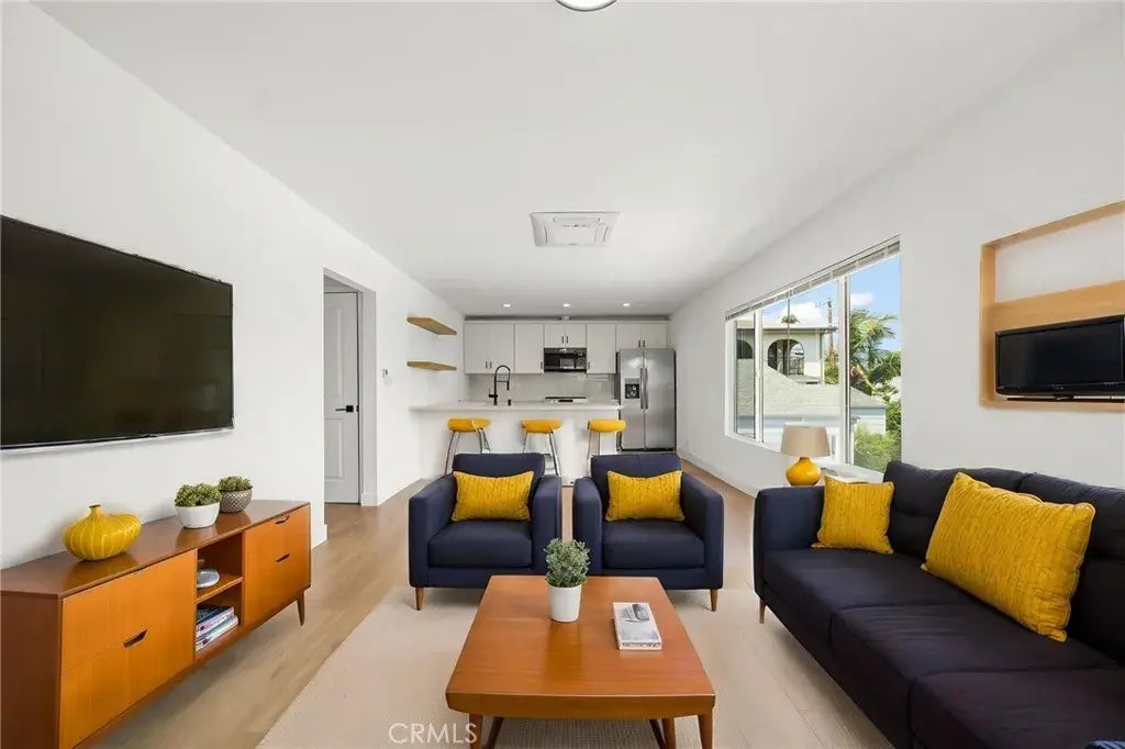 Harbor View apartment - move-in ready! Recently fully remodeled, this bright upper unit has no shared walls and only one neighbor below. Two bedrooms and two baths that could function as two primary suites. Convenient, in-unit stacked laundry with washer & dryer included. Open concept living and kitchen areas feature views to lush neighborhood, Alma Park, harbor and mountains beyond. Kitchen is fully equipped with stove, microwave, dishwasher, refrigerator, stone countertops and breakfast bar. Central HVAC, separate water-heater, all electric. Huge, flat front yard common area, one garage parking space. All this situated in a quiet, residential neighborhood not far from shopping and public transportation.
