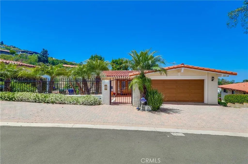 This custom-built Mediterranean-style residence located on one of the most coveted streets in the red tile roof section of Miraleste, exudes timeless charm and sophistication. Built in 1975 by original owners and first time offered for sale, the bones are great and with a few cosmetic improvements, this could be your dream home! Enter through a private gated courtyard to intricately hand-carved double doors that lead to a grand formal entryway. This remarkable home features vaulted ceilings, Spanish archways, an elegant formal living room, formal dining room, plus a large family room with a stunning arched floor-to-ceiling brick fireplace. The gourmet kitchen boasts custom solid hardwood cabinetry, a center island and granite countertops. A cozy breakfast nook with a garden window offers serene views of the tranquil canyon, filled with the sounds of chirping birds and hummingbirds fluttering among the towering pine trees. Revel in the breathtaking twinkle of city lights, the San Gabriel mountains, and canyon views from the deck off of the family room, kitchen, dining room, and downstairs bedrooms. The lower level hosts an oversized primary suite with a sitting area and a spacious primary bathroom with a vanity & walk-in closet. There are two additional generously sized bedrooms, a full bathroom, and ample storage space. The charming entry with its private courtyard is fully fenced. Situated on Via Frascati, a quiet, one-way, tree-lined street, this home provides a peaceful retreat from the bustle of the city while remaining a short drive from freeways, resorts, and scenic n
