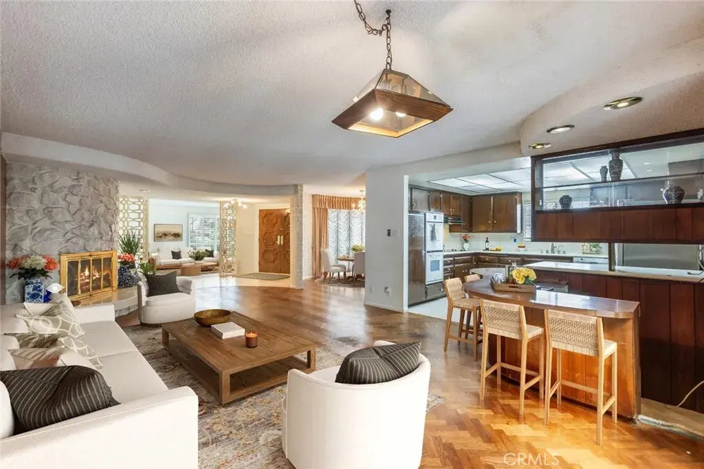 Nestled in a peaceful Torrance neighborhood, this beautifully designed, stunning mid-century modern home offers a perfect blend of style, character, comfort and functionality. The glistening Terrazzo stone and intricate hardwood herringbone floors are a welcome surprise adding a sense of timeless sophistication and class unlike any other home in this desirable neighborhood! Boasting 3 spacious bedrooms including a serene primary suite with a private bath plus an additional "flex space" AND detached workshop across the patio, this residence provides ample space for both everyday living, entertaining and much more. The formal living room with gorgeous glass accent wall, plantation shutters and accent lamp add a sense of past and present beauty. The absolutely stunning and captivating dining room with a curved glass wall will take you to another place and time and exudes timeless elegance. A separate family room opens seamlessly to the kitchen providing a cozy retreat for relaxation or spending time with family and friends. The novel sunken wet bar completes the flowing, open floor plan including the kitchen with separate laundry room and guest powder room. The primary bedroom with private bath features a separate shower and sunken tub. The entrance to the primary bedroom includes a wall of his/her closets and additional storage behind the wardrobe doors. The freshly painted accent walls in all bedrooms add a warm contrast and enhance the size if each room. The main bath with mirrored walls, double sinks and a private shower/toilet area can accommodate more than one person whi