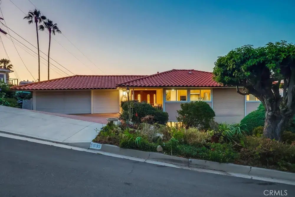 Gracefully set amid lush greenery in the prestigious Miraleste enclave of Rancho Palos Verdes, this timeless Mediterranean-style residence exudes warmth, privacy, and long-term pride of ownership. Meticulously maintained by the same family since 1979, the home boasts commanding curb appeal with its classic red tile roof, inviting covered front porch, and stunning leaded-glass double door entry with sidelights. Inside, the upper level unfolds with a sense of refined comfort. The spacious primary suite is a tranquil retreat featuring dual closets, a well-appointed bath with dual-sink vanity, and panoramic city light views. The adjoining living and formal dining areas offer an elevated setting for entertaining, with rich hardwood laminate flooring, a stately fireplace, and expansive windows showcasing sweeping vistas of the harbor, mountains, and twinkling skyline. The gourmet kitchen is both stylish and functional, featuring natural wood cabinetry, tile countertops, and a sunlit breakfast nook. Plantation shutters, dual-pane vinyl windows, and central heating and air conditioning elevate both form and function. The lower level continues the homes luxurious feel, anchored by an expansive family room with a second fireplace and direct access to a beautifully landscaped backyard featuring a spacious patio and manicured lawn. Three generously sized bedrooms, a full bath with spa tub, an additional bath, and a dedicated laundry closet complete this levelcomplemented by plush new textured carpeting and a freshly painted interior. A walk-in basement offers exceptional bonus space,