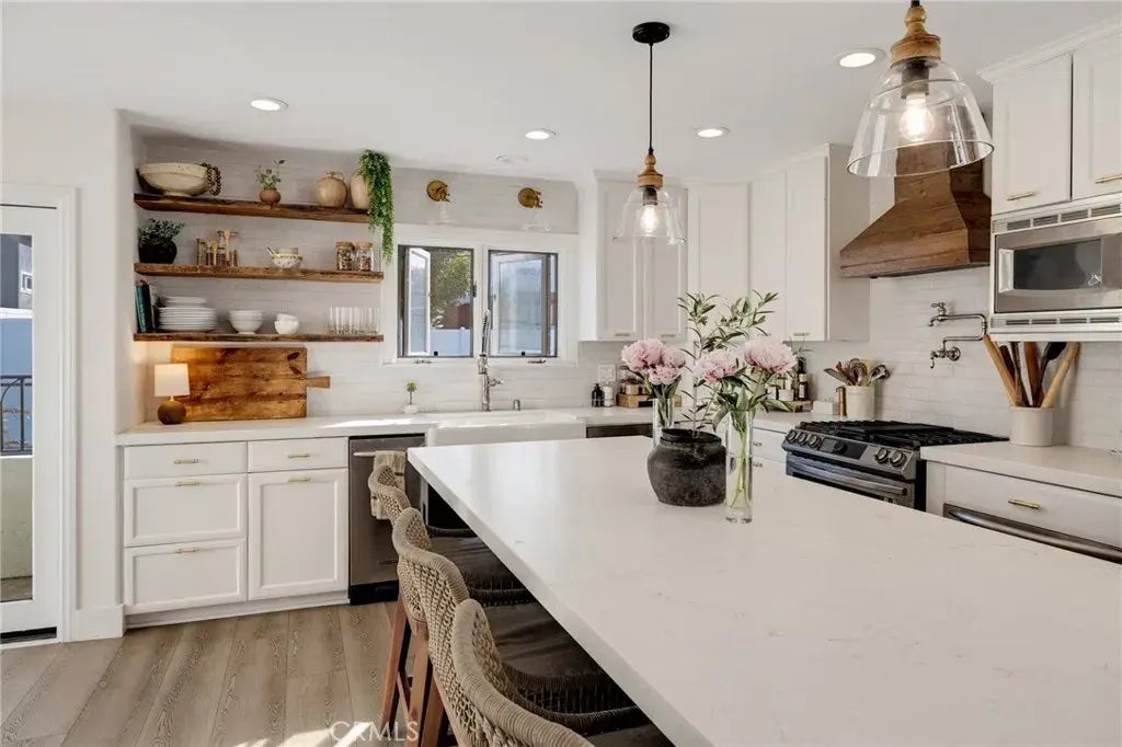 Introducing a designer-perfect Golden Hills home on the border of Redondo Beach and Hermosa Beach that seamlessly blends coastal charm with custom craftsmanship and modern luxury. Bathed in natural light and positioned west-facing to capture cool ocean breezes, this thoughtfully updated residence showcases exquisite custom millwork, newer luxury vinyl flooring, and recessed lighting for a bright, polished feel throughout. The entire top level is dedicated to open-concept living, featuring the spacious living room, dining area, kitchen, powder room and custom laundry roomcreating a seamless flow ideal for entertaining and everyday life. The heart of the home is a stunning kitchen featuring a farmhouse apron sink, a pasta pot filler over the range, stainless steel appliances, quartz countertops, abundant cabinet space with built-in bench seating, and a generous island with bar seating that flows effortlessly into the dining areaperfect for everyday living or entertaining. The living room boasts a custom built-in bar with wine fridge, surround sound, and expansive views, making it the ideal place to gather and unwind. Located on the entry level, a luxurious primary suite offers a serene retreat with high ceilings, a cozy fireplace, attached balcony with mountain views, a spa-like bath with a soaker tub, custom vanity, and dual walk-in closets. The custom-designed laundry room is outfitted with white oak built-ins and a Samsung Bespoke washer/dryer for elevated functionality. Downstairs a full bathroom and two bedrooms with one opening to a private backyard oasis with low-maint