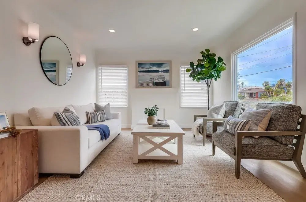 California Coastal Living at an affordable price. This beautiful one level home situated on a large flat lot has been wonderfully remodeled and exudes a cool beachy vibe. Located just a short walk or drive away from the ocean bluffs, Pt Fermin Park, Royal Palms State Beach and the White Point Nature Preserve, you'll enjoy cool breezes and fresh ocean air on a daily basis. This cottage sits back from the street with a large freshly landscaped front yard that gives it great presence from the curb. Inviting front porch greets you as you find your way into the living area with decorative fireplace and a large picture window to allow the natural light into the space. From there you'll go into the spacious sunlit dining area that opens up to the newly remodeled kitchen featuring Kolville "Barley Oak" cabinetry, "cement-look" quartz countertops, pebble tile backsplash and Frigidaire Gallery stainless steel appliances. Adjacent to the kitchen is the laundry room that offers additional cabinetry and a door to access the rear yard. Main hall offering a coat closet and linen cabinets leads you to the two spacious bedrooms that offer ample closet space. The full bath is also new with custom tile finishes and quality fixtures. Gorgeous wide-plank White Oak hardwood floors (not laminate) have been installed throughout and the home's interior has been freshly painted. Other interior upgrades include recessed lighting, new door hardware and light fixtures, mirrored closet doors & 2" faux wood blinds. A new forced air heating & air conditioning system has been installed for year-round comfo