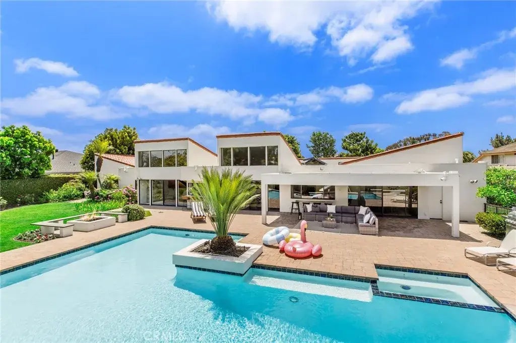 First time on the market and turnkey! Presenting a rare opportunity to own a truly exceptional, meticulously maintained, expansive one-level custom Mid-Century Modern style estate with a Spanish flair. Perfectly positioned on one of the premier lots on the coveted enclave "The Island" in Lakewood Country Club, this property featured in multiple magazines and architectural tours is all about lifestyle. The Palm Springs-inspired yard with sparkling pool and spa backs to the golf course, giving serene open space vibes with distant views of the San Gabriel Mountains on a clear day. Step inside to be greeted by a lush atrium with water feature and soaring ceilings creating gallery-worthy wall surfaces and lighting ideal for showcasing your most prized fine art. Thoughtfully designed rooms and ease of indoor-outdoor living make this architectural gem an entertainer's dream. Easily host friends and family in the ample outdoor areas, delightful game room, and around the walk-behind bar that services both the backyard pool area and interior. The kitchen is in keeping with the style of the home with high end appliances, a walk-in pantry, desk area, and multiple adjacent dining options. The private bedroom wing features a spacious primary suite with sauna and connected bedroom, four additional bedrooms that share two bathrooms, as well as a separate half bath for guests. Cozy guest or in-law quarters with full bath off the laundry room rounds out the seven bedrooms. A 3-car garage with workshop area as well as a driveway that allows parking for 5 additional vehicles means plenty of of
