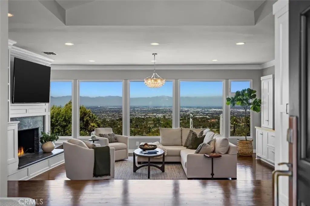 Tucked away in one of Rancho Palos Verdes most serene and private enclaves, this timeless East Coast-inspired estate delivers panoramic views and exceptional living on a scale rarely seen. Gaze from the Santa Monica coastline to the Hollywood sign, and beyond to Downtown Long Beachall from the comfort of your own backyard. This home captures the essence of refined coastal living with an effortlessly elegant interior remodel that blends warmth, texture and sophistication in every detail. Inside, the soaring ceilings and distressed hardwood floors create a welcoming sense of scale and craftsmanship. The formal living room is anchored by a stately soapstone fireplace and custom built-ins, offering an intimate yet grand space for entertaining or quiet evenings at home. At the heart of the residence is the stunning chefs kitchendesigned for both beauty and function. A generous marble island provides the perfect gathering place, framed by soapstone countertops, custom cabinetry and high-end appliances including a professional Thermador range, warming and microwave drawers and a built-in refrigerator. Coffered ceilings and recessed lighting add subtle architectural interest throughout. Just off the kitchen, the formal dining room is warm and inviting with another fireplace, custom built-ins and French doors that open to a tranquil deckideal for al fresco dining or sunset cocktails. The primary suite occupies its own wing upstairs, with a private balcony to take in the ever-changing skyline. The spa-like bath features white marble finishes, dual vanities, a jetted tub, oversized sh