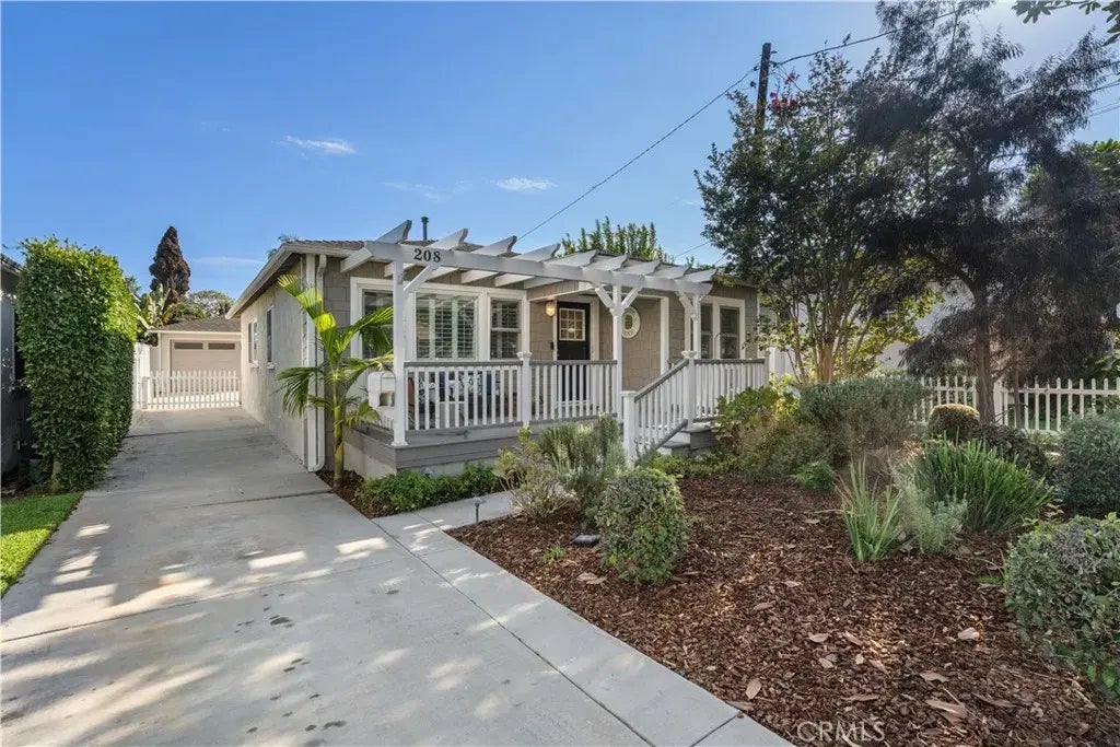 208 West Walnut Avenue in El Segundo welcomes you with its whimsical front yard landscaping, shingled grayish-green Cape Cod exterior, accented by crisp white windows and a classic white arbor. Stepping inside, youre greeted by original hardwood floors in the living room, where an arched entryway flows seamlessly into the dining room. Both spaces are adorned with plantation shutters, creating a timeless and inviting atmosphere. The entire home has been freshly painted, including the kitchen cabinets, giving it a bright and polished look. In the kitchen, youll find an efficient layout with ample storage, a built-in Kitchen Aid refrigerator, and a cheerful window above the sink that fills the space with natural light. Three well-appointed bedrooms complement a bathroom that features a seamless barn-style shower door, built in bench, chrome fixtures and nostalgic penny tiles. The 1,080-square-foot main house is connected by a lush green space to the 780-square-foot playroom, permitted in 1957, complete with vaulted ceilings, a bar area, half bath, and sliding doors leading to a spacious private patio. A white picket gate encloses the driveway, while the two-car garage provides laundry hookups and abundant storage. Some noted features for the main house are central heating and cooling, two sets of dual-paned windows throughout, and a tankless water heater, offering modern comfort alongside timeless charm.