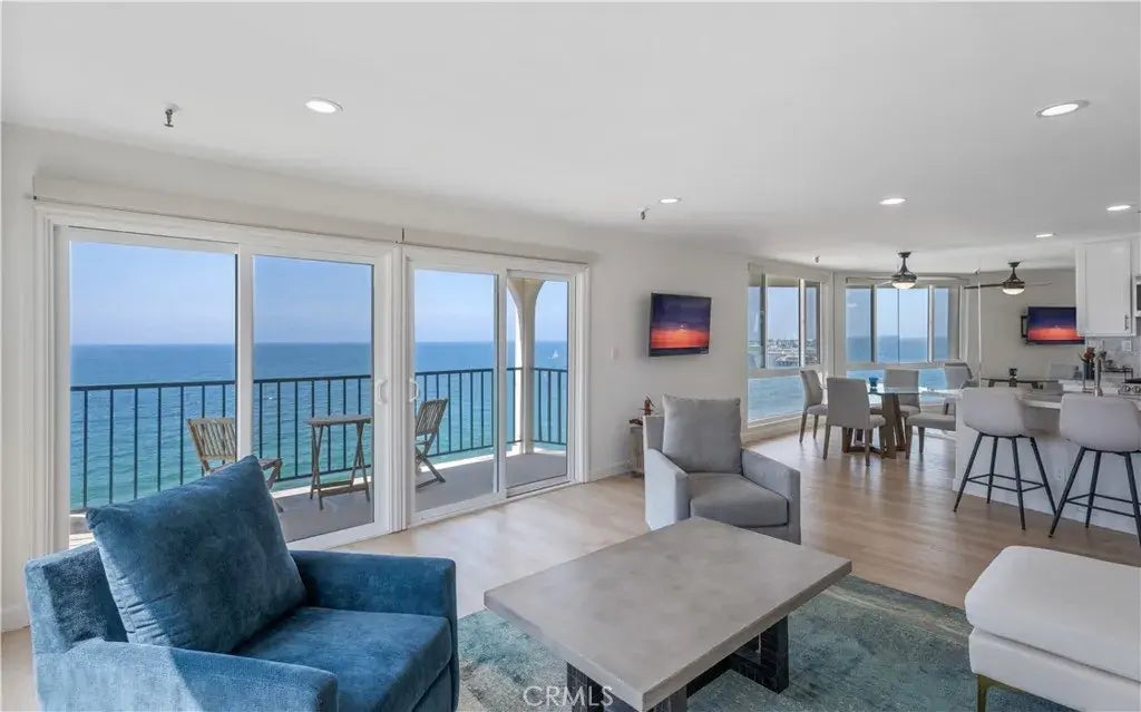 Fully furnished and recently remodeled panoramic ocean view and beachfront property with 180-degree balcony view from Palos Verdes to Santa Monica Mountains. Enjoy full ocean views from every window. You can hear the waves from your living room and kitchen. Feel the ocean air! You literally can't get closer proximity to the ocean. Situated on the third floor of the building, one-bedroom condo feels massive when your fourth wall is the great Pacific Ocean. Updated kitchen and bathroom. Covered, secured parking for 1 car. Community Jacuzzi and laundry. Spectacular location in the South Bay. Short walk to the Redondo Beach Pier and The Village restaurants, fish markets & farmer's market. Year-round beach living or your incredible getaway. To Live, Live by the Sea.