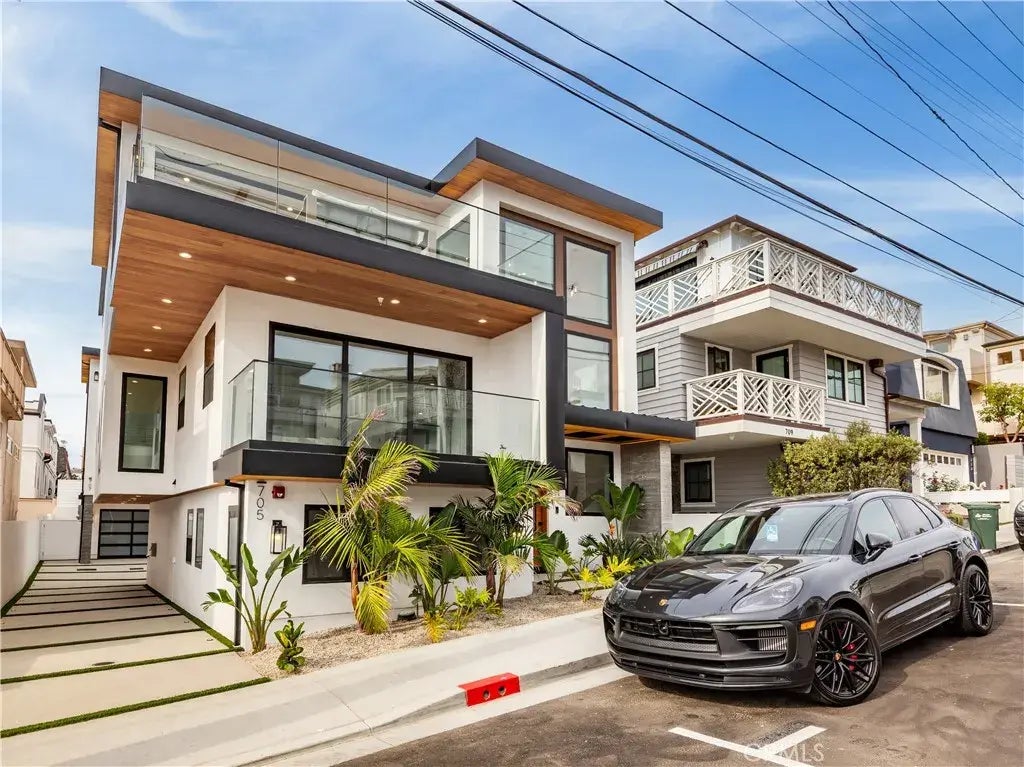 This 4-bedroom, 4.5-bathroom coastal modern townhome embodies luxury, style, and sustainability. Meticulously designed, this 2,831 square foot masterpiece features a gourmet kitchen equipped with top-of-the-line Sub-Zero and Wolf appliances, complemented by a spacious 10-foot marble island, white rift oak cabinetry, and custom underlit lighting that adds a warm, elegant touch. The open-concept living spaces are adorned with solid oak wide-plank flooring, high-end Andersen windows and oversized sliders. The primary suite is a private retreat all its own, complete with a spa-inspired bath featuring a freestanding soaking tub, glass-enclosed walk-in shower, dual vanities, and direct access to a serene outdoor deck. Every detail, from the underlit cabinetry and stair lighting to the power-saving fixtures and sustainable wood accents, speaks to quality craftsmanship and thoughtful design. As day turns to night, architectural outdoor lighting along the homes exterior and pathways sets the tone for relaxed luxury. And above it all, the rooftop deck with gas and water hookups offers panoramic views of the Queens Necklace, ideal for entertaining, relaxing, or simply taking in the beauty of the South Bay. With a wine cellar, three-stop elevator, and multizone smart climate control, this home offers a lifestyle as effortless as it is exceptional. Every day is truly a reminder: When you buy here, you're buying a lifestyle!