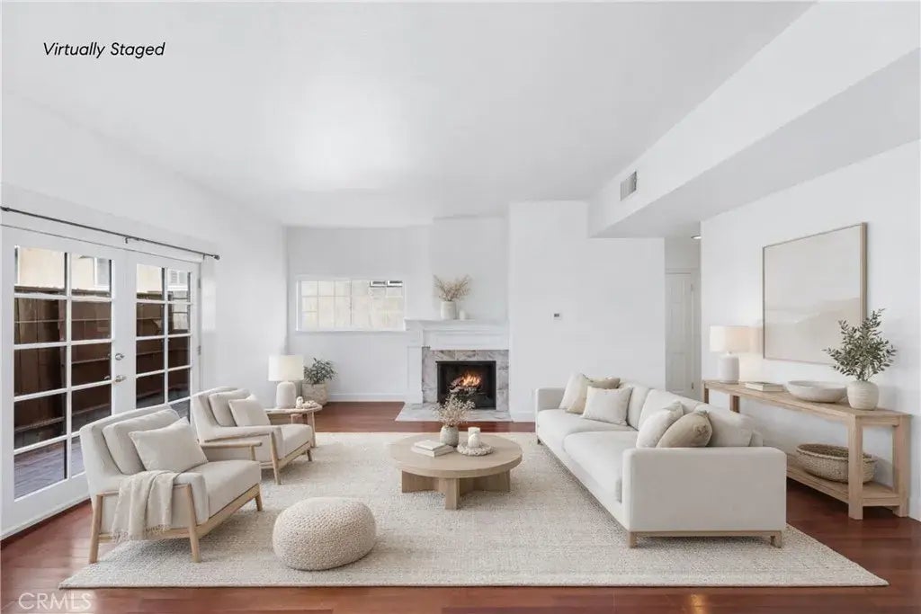 Quietly situated as a rear-unit townhome, 1515 Artesia Blvd Unit #2 is a charming retreat. Upon entry, the home is bathed in natural light and features hardwood floors throughout. The living room includes a fireplace and French doors that open to a private outdoor patio, creating indoor-outdoor flow. Just two steps up, the dining area features a second set of French doors leading to a private terrace and connecting to the adjacent kitchen, which offers ample storage and breakfast bar seating. A powder room and direct access to the two-car garage complete the main level. Upstairs, both bedrooms feature en-suite bathrooms. The primary suite offers vaulted ceilings, a private outdoor terrace, generous natural light, a large walk-in closet, and an en-suite bathroom with a glass-enclosed shower. The secondary bedroom features high ceilings, an en-suite bathroom, and ample storage. An upstairs laundry room with built-in storage and a skylight providing additional natural light completes the upper level. With easy access to downtown Manhattan Beach shops and dining, as well as LAX and major freeways just minutes away, 1515 Artesia Blvd Unit #2 presents convenience, charm, and everyday livability.
