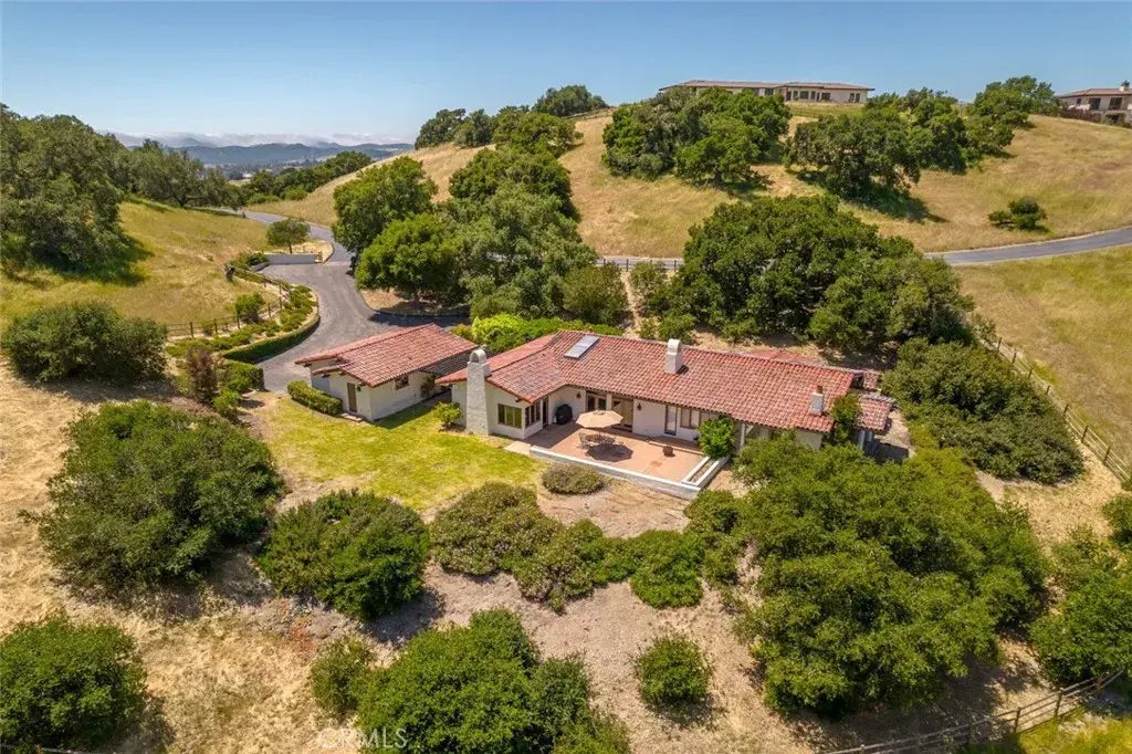 Welcome to Varian Ranch, an exclusive gated community that offers unique amenities you won't find anywhere else. Imagine having your horse practically in your backyard with over 3000 acres of trails on which to ride. This equestrian-friendly community provides horses with multiple pastures, and a fully equipped stable and arena. The Spanish Mission style home is one of only 49 in the community, featuring adobe walls, a clay chimney, copper gutters, and a barrel tile roof. Custom built with exceptional craftsmanship, it offers luxurious radiant heating, ensuring perfectly balanced temperatures in every room. The property offers privacy and tranquility and is adorned with prolific lemon, lime and orange trees and a front yard showcasing three truly magnificent oaks. As you enter the walkway, you'll be greeted by fragrant wisteria climbing the pergola. The home welcomes you with high vaulted ceilings and a sunny living room clerestory bathed in natural light. French doors provide immediate access to stunning mountain vistas with breathtaking views. To the left, you will find three bedrooms and two bathrooms. The master suite, located at the end of the hall, boasts French doors, a luxurious master bathroom with dual vanities, a large soaking tub with picturesque views , a shower and two separate closets. The master bedroom has a private patio for savoring the natural beauty of the ranch. And to the right, the home offers a family room with a fireplace and a corner window seat, the kitchen, and the dining area. The kitchen features a large island, ample storage, double ovens, a