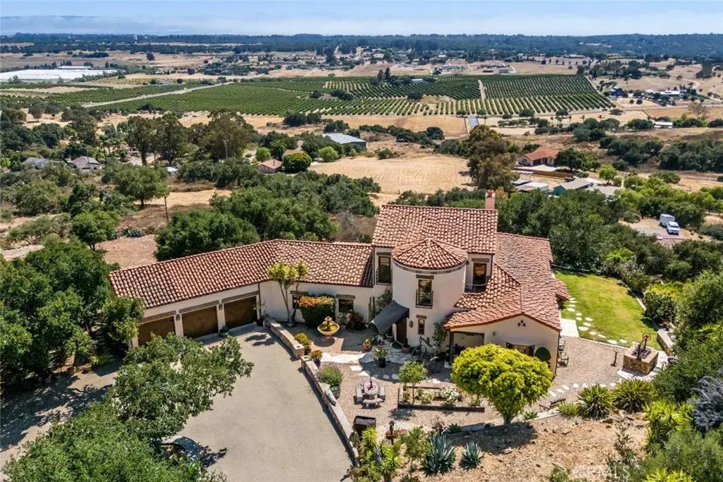 Beyond a private gated entrance, this extraordinary estate unfolds across 10.19 acres studded with avocado trees in the coveted Nipomo East region. Evoking the soul of California's rancho heritage, the property blends Spanish revival architecture with equestrian elegance, offering an exceptional retreat defined by craftsmanship and timeless design. As you pass a classic barn and pastures with welded oil pipe fencing, the estate reveals itself through a graceful circular driveleading to an attached three-car garage and additional space thoughtfully designed for RV accommodation. A flagstone and brick walkway leads you to an impressive 8 foot mesquite and copper front door and custom copper canopy, setting the tone for the residence within. Spanish tile floors, soaring beamed ceilings, and meticulous copper and ironwork welcome you into a space where artistry meets serenity. The main living area, anchored by a statement fireplace, invites intimate gatherings or quiet moments of reflection. Adjacent, the kitchen balances vintage charm and modern function, featuring bar seating, a generous island, full pantry, wine cellar with antique doors, and a striking vintage Elmira stove and ovena true homage to tradition. Flowing seamlessly from the dining room, the backyard unfolds into a lush landscape with a signature Santa Maria-style BBQ and native plantings, designed for both celebration and repose. A sunroom offers a refined escape for year-round entertaining, with a fireplace for crisp mornings and double doors opening to breathtaking panoramas stretching to the distant Pacific.