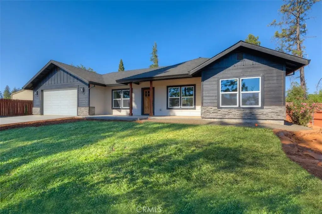 Nestled at the end of a peaceful court in the rapidly growing town of Paradise, this newly constructed home exudes charm and quality craftsmanship. Set on a hill with mature trees and a rock retaining wall, the property boasts a lush, fresh lawn and a convenient parking/storage pad by the road. Built with exceptional care by a local builder, the home's curb appeal shines through with striking contrast colors, stone accents, and a welcoming covered porch with a wood entry door. Inside, you'll find vaulted ceilings and an open-concept layout, featuring custom knotty alder cabinetry, a spacious pantry, quartz countertops, and a beautifully tiled backsplash in the kitchen. The primary suite is generously sized, complete with a double-sink vanity and an upgraded walk-in tiled shower. On the opposite side of the home are two spacious guest rooms and a full hall bath, offering privacy and comfort for family or guests. Step outside to a covered rear patio, perfect for relaxing or entertaining, and enjoy the large, level backyard surrounded by wood fencing. This is a home designed to be lovedcome see it and fall in love with both the home and its perfect location.