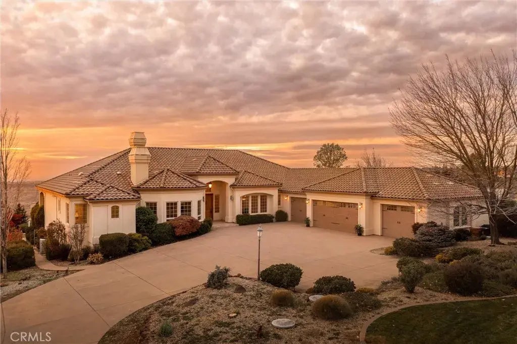 Welcome to Paradise! This breathtaking custom Mediterranean estate, built in 2008, is nestled at the end of a gated cul-de-sac, offering unparalleled million-dollar views of historic Honey Run Road, Skyway, Butte Creek Canyon, the Valley floor, and the stunning Coastal Range. Spanning 4,763 sq. ft. on 6.15 acres, this grand residence features 4-5 bedrooms, 3.5 bathrooms, a 4 car garage with an EV charging station, and owned solar. Inside, the home showcases a dramatic entryway, soaring ceilings, and exquisite wood beam accents in the family room. The family room is a showstopper, boasting a floor-to-ceiling rock fireplace and panoramic views through expansive windows. The gourmet kitchen is a true entertainers dream, featuring two oversized islands with granite countertops, custom cherry cabinetry, stainless steel appliances, a spacious walk-in pantry and a large breakfast nook. A formal dining room, formal living room with a fireplace, and custom office (or optional fifth bedroom) add to the homes functionality. Adjacent to the kitchen, youll find a convenient bathroom and a bedroom featuring outdoor access and a spacious walk-in closet. Down the hall, two additional bedrooms each boast their own walk-in closets and share a well-appointed Jack and Jill bathroom. The luxurious primary suite is tucked away in a private wing, offering dual walk-in closets, a spa-like bathroom with a soaking tub and walk-in shower, plus a hidden closet. Step onto the expansive composite deck directly from the primary suite or kitchen, where youll find a built-in outdoor kitchen, ample seating/