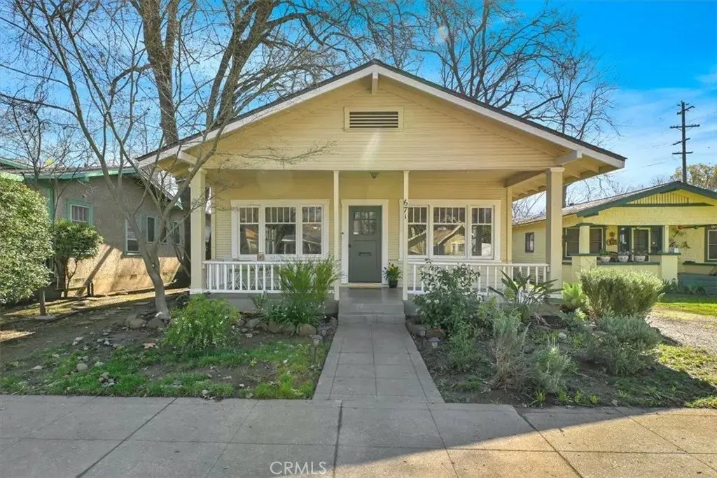 Welcome to this charming Chico home in the coveted "Golden Triangle", just a few blocks from the beautiful Bidwell Park! This classic beauty features a recently remodeled kitchen with open shelving, butcher block countertops, a sunny garden window for your herb garden, and a top-of-the-line six-burner Bertazzoni range/stove. Whether you're cooking up a feast or enjoying a quiet meal, the built-in beer tap on the counter adds a unique touch to this modern kitchen and is sure to be a conversation piece! The open-concept layout creates a seamless flow between the kitchen, dining, and living spaces, perfect for both relaxed living and entertaining. Down below you'll find a basement area for additional storage. The living room is complete with a wood burning fireplace, high ceilings, and timeless French windows to let the fresh air in. The large covered front porch is "so Chico", ready to relax on and visit with the locals. Step outside to the low-maintenance backyard, where youll find a concrete seating area designed for entertaining around a portable fire pit for example. There's plenty of room to design your urban garden back here or entertain guests with outdoor dining. With its ideal location, stylish upgrades, and inviting outdoor spaces, this Bungalow is a true Chico charmer!