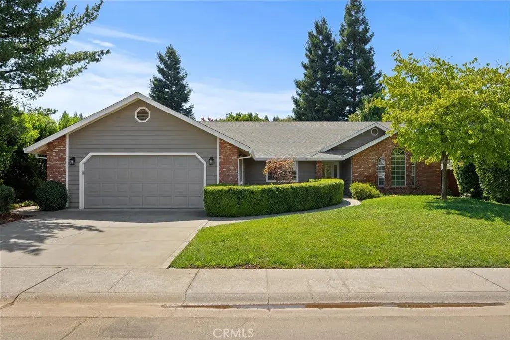 This charming, traditional home, featuring a brick facade and a curved sidewalk leading to the front entrance, is tucked away near the end of a cul-de-sac street. Recently renovated, it features new flooring and painted cabinetry, presenting a pristine, turnkey condition ready for immediate occupancy. The home features an impressive entry. Beautiful double French doors lead into a formal living room featuring large windows, a vaulted ceiling, and a dedicated formal dining room. The open floor plan seamlessly connects the family room, with its vaulted ceiling and gas stove, to the spacious kitchen and eating area. The kitchen boasts granite countertops, an island, and a sink perfectly positioned at the window overlooking the backyard. Enjoy meals in the eating area in front of a lovely bay window. A French door from the family room leads to a serene covered patio. The master suite has two closets and offers a private door to the backyard. Its ensuite bath is a private oasis with a large corner tub, step-in shower, dual sink vanity, linen storage, and a private water closet. A hall bath serves additional bedrooms with a dual sink vanity, a water closet, and a full bathtub/shower. Convenience is key with a large laundry room providing cabinetry for extra storage and a sink. The shady backyard, with its mature trees and covered patio equipped with ceiling fans, offers a cool retreat on warm summer days. A corner shed offers ideal space for a garden project or simply additional storage. An oversized two-car garage provides ample space and includes a drop-down ladder to attic sto