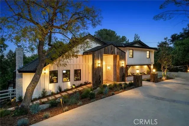 A modern transitional-style farmhouse provides endless hours of enchantment. Situated within the prestigious gated equestrian community of Hidden Hills, this exquisitely remodeled home epitomizes tranquility and luxury living. As you step into the grand foyer, high vaulted beamed ceilings welcome you. The main living area boasts exquisite large plank European white oak flooring, while custom LED lighting illuminates the space with a modern flair. The heart of the home, the gourmet kitchen, now features top-of-the-line appliances including True refrigerator and freezer and La Cornue range. The kitchen also boasts all custom cabinetry, custom pantry, oversized island with imported natural quartzite countertops throughout. A fabulous wet bar, complete with a fridge and ice machine, custom brass and glass shelving, adds a touch of sophistication, perfect for entertaining. Above the great room, sits a library with a custom bookshelf, stylish wainscoting, and an enclosed wine room with custom accent wall collage with wine boxes, making it a true piece of art. Upstairs, the primary en-suite is a sanctuary unto itself, featuring a lavish spa-like bathroom with a walk-in shower, freestanding tub, and custom LED-lit walk-in closet. Step outside onto the expansive wrap-around porch, where a private Jacuzzi awaits, offering serene views of the lush surroundings. Below, a cascading waterfall spills into a resort-style pool, surrounded by a meticulously landscaped rose garden, lined with tons of evergreen trees, a fruit tree garden, and two dramatic mature oak trees. The property exudes