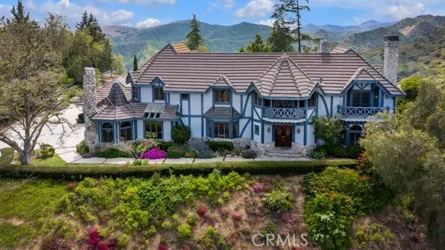 Experience 360-degree views and serene living in this inviting Tudor-style home, featuring 5 bedrooms, 5 baths, and a 1+1 guest unit on 1.3 acres. Enjoy breathtaking sunrises over the San Fernando Valley and sunsets over the Santa Monica Conservatory from every room. This custom-built residence boasts a split staircase, a spacious living room with an oversized marble fireplace, and a formal dining room with beveled glass doors, a stunning crystal chandelier, and custom diamond windows. The gourmet kitchen is equipped with three ovens, a warming drawer, BBQ, restaurant-grade gas range, and breakfast bar, opening to a family room with wood floors, a full bar, and an entertainment pit with a fireplace and stained glass windows. The master suite includes a sitting area, fireplace and large ensuite bathroom featuring a spa tub, shower, and a huge walk in closet. Upstairs boasts 3 additional bedrooms and 2 baths and downstairs features a bedroom or office and an attached guest unit with a kitchenette and vaulted ceilings. This home offers gorgeous views from every window! Outdoors, enjoy a renovated waterfall pool and a large flat yard perfect for horses or a pickleball court. Bell Canyon has countless amenities to enjoy such as community tennis courts, gym, equestrian center, park, private hiking trails and countless community events to get to know your neighbors. Don't pass up this rare opportunity to own a home that has it all in the prestigious guard gated Bell Canyon located within the Las Virgenes School District! This home offers privacy, nature, and tranquility, making it