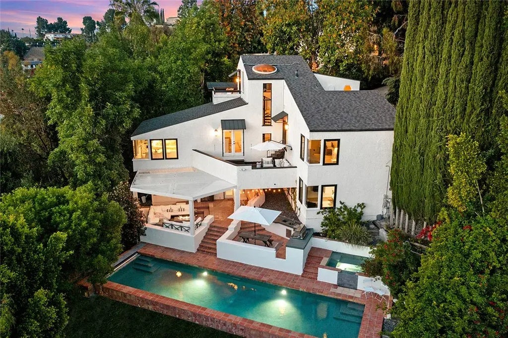 Situated behind its own private gates in a coveted enclave off of Mulholland Drive, enveloped in a treetop canopy on almost half an acre of unsurpassed privacy, this fully reimagined 4 bedroom 4 bath estate spans 4400 sq ft and includes a separate guest quarters with its own full kitchen and bath. Seamless outdoor living includes a large covered seating area, kitchen island with dining, along with a heated saltwater pool and separate spa that adds an additional 1000 plus sq ft of alfresco living surrounded by nature. This magical compound combines contemporary sophistication and quaint charm, with its airy and calming colors, refined finishes, and expansive outdoor entertaining space, it feels like your own private luxury boutique resort. Down a long tree lined gated driveway, tucked into the hillside, youll find the double door entry which leads to a stone foyer with a statement spiral staircase that spans all levels of the home. On the main floor is a wood beamed open concept living and dining room, streaming with light and bleached solid oak flooring, with French doors leading to a large two level deck. Along with a bright kitchen with breakfast nook, tranquil views, and white Carerra stone counters. The primary suite is also on the main floor and has vaulted wood ceilings, canyon views, with a spa like bath that includes a two person carerra stone shower and soaking tub with picture window. Upstairs is a loft library with driftwood beams, a built in reading nook, and home office area with incredible views. The lower level has two bedrooms and a full bath with a wood bea