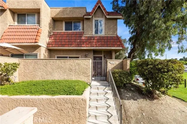 Amazing END UNIT with 3 bedrooms, 3 FULL baths, light and bright tri-level Tres Robles townhome with 1268 square feet and 2 car direct access garage. Enter the home to fresh, NEW paint throughout, NEW carpet, tiled floors and fireplace in the cozy living room with slider to private, spacious patio. Next level with a remodeled kitchen with granite counters, Thomasville cabinets and drawers, pull out shelves in pantry, all stainless-steel appliances and beautiful bay window letting in the natural light. Bedroom / office with spacious closet and bathroom with walk-in shower. Upstairs has TWO MASTERS with spacious closets (one is a walk-in) both feature their own ensuite, one with shower/tub combo and the other with a walk-in shower. NEWER vinyl windows throughout. Laundry in the spacious 2 car garage. This unit is right next to a private green belt and very peaceful. This community features a sparkling pool, spa, tot lot, RV parking upon availability, walking paths, and short drive to the 14 freeway, Costco, fantastic restaurants, shopping, entertainment, schools and SCV biking paths. The perfect location for all that Santa Clarita has to offer!