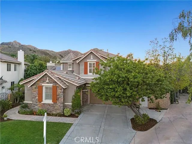 Welcome to the Prestigious Southern Oaks neighborhood of Stevenson Ranch! This stunning POOL and VIEW home, located on one of the most sought after, family friendly cul-de-sacs in the entire neighborhood, offers over 3,330 square feet of living space and SOLAR. The largest model in the Grove tract features the most desirable of all the floor plans with 5 bedrooms, plus an office (or 6th bedroom), 4 1/2 bathrooms, and an upstairs alcove with custom built-in desk with bookcases. The first floor features a mother-in- law/au pair suite with bedroom, en-suite bathroom and is complemented by a versatile flex space created from the third-car garage conversion, perfect for home office or gym and a separate entrance through French doors. The dream kitchen is a chefs delight, with newer dishwasher and microwave, an abundance of beautifully updated quartz counter space, a walk-in pantry, and a large center island and seating for barstools. The kitchen opens to a dining nook and a spacious family room, which features a second fireplace, wraparound raised hearth, and custom built-ins. Designer touches throughout the home including newer luxury vinyl plank flooring, new carpet, fresh neutral interior paint, plantation shutters, ceiling fans and a split two-car garage with direct access, new garage door opener, EV charger and storage cabinets, and a separate one-car garage. The private outdoor space is an entertainer's paradise, complete with newly built, custom designed salt water pool/spa with child safety fence, exterior TV cabinet with 50 TV remote lift, 220 volt outlet, freshly paint