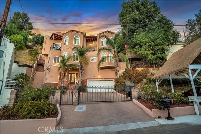 Welcome to the home you've been waiting and searching for! Nestled on a serene street, and featuring breathtaking views, this stunning Mediterranean style residence exudes charm and elegance. Built in 1991, this meticulously maintained home offers a private gated entry and a beautiful paver driveway, setting the stage for the luxury that awaits inside. Step inside and be captivated by the expansive living spaces flooded with natural light, perfect for both relaxation and entertaining. The showcase smart home features three spacious bedrooms, each with its own remodeled en-suite bathroom, private balconies and gleaming hardwood floors, ensuring comfort and privacy for everyone in the household. The heart of this home is the updated "Chef's" Kitchen, adorned with granite countertops and top-of-the-line Kitchen Aid and Viking appliances. Adjacent to the kitchen, the large open living areas feature include your living room, dining room, wet bar and den, complemented by two cozy fireplaces, high ceilings, crown molding, recessed lights, ceiling fans and plantation shutters, creating an atmosphere of warmth and sophistication. For added convenience and versatility, an enclosed sunroom and sauna on the upper level of the rear yard offers the perfect space for a gym, yoga studio, art studio, sauna or simply a peaceful retreat to unwind and rejuvenate. Discover the bonus attached "in-law" quarters featuring a fully updated bathroom, spacious living room, and private bedroom with separate entrances, ideal for guests or extended family members seeking privacy and comfort. Parking is a