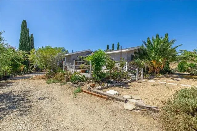 Tucked away in the foothills of Acton, this charming residence awaits. Envision yourself soaking in the serene panoramas that envelop you before entering the bright and welcoming living room, which boasts a cozy rock fireplace. The kitchen, opening to the front room, is equipped with ample cabinets and granite countertops. Next to the kitchen is the laundry room, providing additional storage, and a passageway to the garage. Beyond the front room lies a large, versatile open living area embellished with a full wall of built-in cabinets, hutch, and credenza. A built-in bar adds a touch of sophistication and convenience, perfect for entertaining guests. The home's design seamlessly transitions from the entrance, through a short corridor, to the master suite, featuring a newly updated en-suite bathroom with twin sinks, a striking walk-in shower, and dual closets. The second bedroom is generously sized with plentiful natural light. Outside, there is a vast area for RV parking, a welcoming patio space, and, naturally, the stunning view!