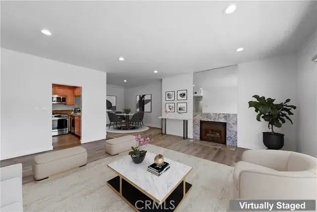 Welcome home to the newly renovated second story condo with 9 ft ceiling height that allows an abundance of natural light streaming from the west and south. This spacious 2 bedroom 2 full bath condo has a lot to offer! Newly updated with laminate plank flooring throughout, recessed lighting, new paint and 2 completely renovated bathrooms. The large primary bedroom has en-suite bath with beautiful new vanity that has generous counter space and cabinet for storage. Primary bath also has a built in linen cabinet for more storage. Main bedroom has custom organized closet with two large mirrored doors that glide open for convenient access to your wardrobe. Through the hallway there is a closet for the stackable washer dryer included with sale as well as another closet for storage and one for the water heater. Generously sized guest bedroom can be used for either a live work space or spare bedroom with mirrored closet doors, roomy storage and large window. Guest bath is completely renovated with new vanity, shower in tub, flooring and lighting. The ultra-bright and airy living room boasts a gorgeous tiled fireplace and a private balcony. This condo comes with 2 secure tandem parking spaces in a gated garage. Centrally located in Palms / Culver City and steps away from Expo Line Palms Station, which runs from downtown to the beach, and the 10 & 405 freeways. Only minutes away from Downtown Culver City's trendy new restaurants, shopping, theaters, live/work culture, studios, and much more!