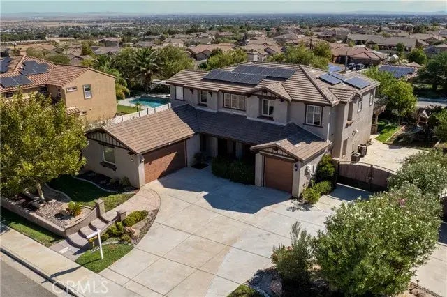 Be Welcomed to this Stunning Turn Key Pool home in West Palmdale. As you enter be greeted by the gorgeous high ceilings and amazing natural light illuminating from the multitude of windows throughout. Enjoy the foyer that opens to the family space and formal dinning area. Next enter the open concept living space with a beautiful fireplace, sliding door access to the back yard and the kitchen. This kitchen serves as the heart of the home, showcasing elegant flooring that exude warmth and sophistication. The ample cabinetry provides both functionality and style, offering plenty of storage for all your culinary needs. You cant miss the large island with the built in sink perfect for entertaining. You'll find a down stairs bedroom and full bathroom with a sink/ tub combo. Make your way upstairs and be greeted by a spacious loft great for additional office space or even a theatre area. Be relaxed as you enter the primary bedroom with attached ensuite and balcony access. Next fine 3 more generously sized bedrooms and another full bathroom. This beautiful residence is designed for comfort and convenience. Venture outside to discover a sizable yard, RV access, a luxurious gated pool and spa, perfect for relaxation and entertaining, making this home a true oasis for all.