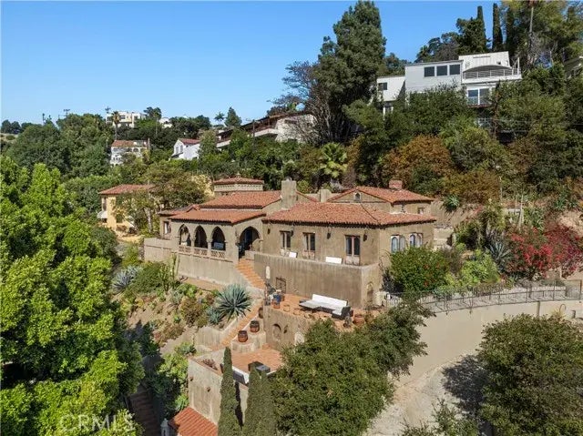 Built in 1926 and designed by Disney Castle Architect, this stunning Mediterranean home offers privacy and serenity in one of Los Feliz's most prestigious neighborhoods. This 2,400 sq. ft. residence boasts 3 spacious bedrooms + bonus room (optional 4th bedroom w/ separate entrance) and 3 bathrooms, offering ample space and comfort. The home has exquisite architectural elements, including traditional archways, hardwood floors, high ceilings, built-ins, and terra cotta tiles that emphasize this home's authenticity and original charm, creating an open, airy atmosphere. Step into the beautifully renovated kitchen with Moorish design features such as Mosharabi woodwork cabinetry, where modern amenities meet timeless eleganceindoor-outdoor living with French Doors from the front to the rear of the home. Two bedrooms have French doors that open to the front veranda and one to the back courtyard. The living spaces have hardwood and terra cotta tile floors, complemented by recessed lighting that adds a warm ambiance. On cooler evenings, you can cozy up by the gas fireplace, creating a perfect setting for relaxation. The dining room has a stunning view of the Mediterranean fountain. Enjoy breathtaking views of the Griffith Park Observatory and city views from the home's southwestern and northern exposure, which provides stunning sunsets and natural light. On a clear day, you can see Catalina Island! The outdoor area is equally impressive, featuring a gas fireplace in the back courtyard with built-in seating, saltillo tile, and a lovely fountain where you can entertain guests or enjoy