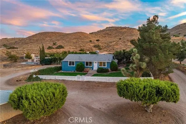 ***LIVE BEAUTIFULLY*** Charming 11 Acre Ranch Home With Breathtaking Antelope Valley Views! This stunning 3-bedroom, 1-bathroom ranch-style home sits on an expansive 11-acre property & offers breathtaking lake and city views of the Antelope Valley! Rated under the highly acclaimed Acton School District, known for its excellent schools, this home is perfect for families seeking both space and quality education. Enjoy modern convenience with solid surface countertops and tile flooring throughout the kitchen and living areas. The large view windows in the living room and Master bedroom provide stunning valley vistas and fill the home with natural light. Cozy up by the wood-burning stove in the living room, which also features ceiling fans for year-round comfort. The Master bedroom includes two large closets and is equipped with a ceiling fan for added comfort, as are the kitchen and second bedroom. Stay comfortable with central heating and A/C throughout the home. Additional conveniences include a pantry, a mudroom, and a front lawn with automatic sprinklers. Enjoy endless summer days with a pool and jacuzzi, complete with solar heating, a large entertainment area, and a covered patio for outdoor gatherings. The property is adorned with over 75 trees, most equipped with drip irrigation on automatic timers, creating a lush, serene environment. For the gardening enthusiast, you'll find producing boysenberry and thornless blackberry plants, along with a koi pond with waterfall and 4 mature koi. This property includes a workshop with a large workbench, ample storage, and two 10'x1