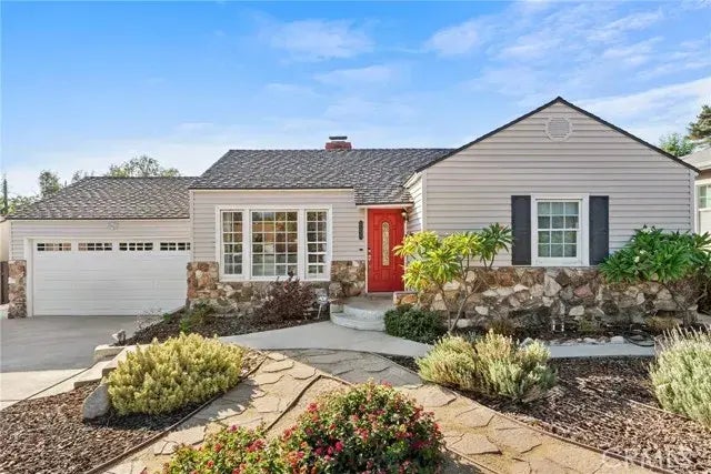 This is it! A beautifully designed 3-bed, 2-bath single-level home with 1,824 square feet, a huge den for entertaining and a separate office. The front yard features curated drought-resistant landscaping, adding to the homes curb appeal while being eco-friendly. Inside, hardwood floors flow throughout, with central air and heat for year-round comfort. The spacious family room is filled with natural light from three skylights, highlighting the vaulted ceilings and providing serene views of the large backyard, which includes a patio and room for a pool. The updated galley-style kitchen is equipped with sleek stainless-steel appliances, perfect for the home chef, while a separate office area or craft nook adds flexibility. The primary bedroom is a peaceful retreat, complete with a walk-in closet and a luxurious ensuite bath with a soaking tub, shower, and double vanity. Additional features include paid solar panels for energy savings, a 2-car direct access garage, and a wide concrete driveway with parking for up to 4 cars. Situated on a quiet street with scenic views of the Burbank Mountains, this home blends style, sustainability, and outdoor potential in a desirable location.