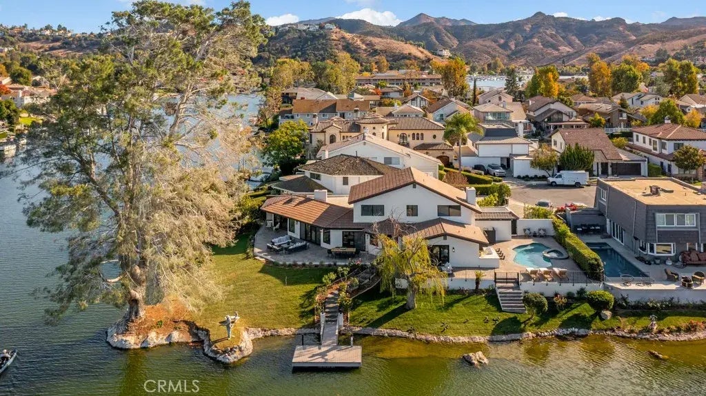 This luxurious 10,884 sqft corner lot with over 195 feet of waterfront is situated on the Main channel within the prestigious Guard Gated community of Westlake Island, an oasis of beauty and sophistication nestled in the heart of Westlake Village. Stepping into the home you are greeted with an abundance of natural light that floods every corner. This home offers comfortable living spaces that seamlessly integrate with the amazing outdoor entertaining areas creating the ultimate California indoor/outdoor lifestyle home. The kitchen provides stainless steel appliances with custom cabinetry over looking the lush rose bushes leading to the lake. The downstairs primary bedroom is equally impressive, with picturesque windows that showcase stunning lake, Iconic Island Bridge & mountains views. The oversized spa like master bath boasts an abundance of closet storage space & is fit with a washer & dryer in the primary closet. The secondary bedrooms are oversized with plenty of closet space and conveniently placed next to another laundry room. It is a true luxury to find a sparkling pool/spa complimented by a BBQ area while still enjoying a grassy backyard. Walk out to your dock just steps from your patio and enjoy a sunset cruise or dinner at the landing or Boccaccio's on the water. 24 hour guard gated community on the island & conveniently located to all.