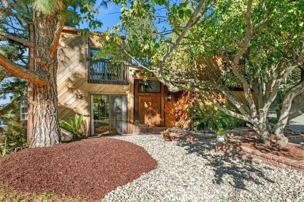 Welcome to this stunning architecturally unique 3 bedroom, 2.5 bathroom+ large LOFT home with 2,941 sq. ft. offering a harmonious blend of comfort and nature inspired tranquility. The grand double door entry features a stained-glass arch that opens to a bright, open floor plan, designed with elegance. Step into the dramatic living room which highlights vaulted beamed ceilings, floor to ceiling double-sided fireplace, glass sliding door, and abundance of natural light. The living room's grand window showcases a serene view of the backyard's lush landscaping, bringing the beauty of the outdoors into every corner of the space. Additionally, there is a large family room that has plenty of light and a sliding glass door with direct access to the backyard, ideal for indoor/outdoor living. The primary suite boasts vaulted beamed ceilings, ample natural light, a private balcony with savoring sweeping views. The en-suite bathroom features a jacuzzi tub framed by a window overlooking nature, making it the perfect relaxation spot. There are two additional spacious bedrooms, both with walk in closets and private balconies, each offering tranquil views and privacy. The versatile large loft provides a great workspace with windows that are ideal for a home office. The kitchen boasts a cozy breakfast nook surrounded by windows and a sliding glass door. A separate formal dining room adds an elegant touch with its dramatic, custom redwood ceiling, making it perfect for gatherings. The backyard offers a grand deck with breathtaking views and a separate yard perfect for entertaining. There is