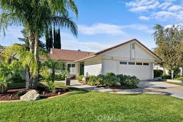 Welcome to this charming 2-bedroom, 2-bath home on a quiet cul-de-sac in the heart of Valencia. With convenient access to Town Center, Valencia Valley Elementary, Whole Foods, and nearby freeways, this "Rockport" floorplan offers an open, bright layout filled with natural light. The upgraded kitchen features granite counters, stainless steel appliances, custom cabinetry with soft-close drawers and pull-out shelves, plus a breakfast nook framed by a bay window with views of the front yards palms. The kitchen refrigerator is included, adding convenience and value. The living and dining area is enhanced by vaulted ceilings, a cozy stacked-stone fireplace, and plantation shutters. The primary suite provides high ceilings, a walk-in closet, and an en-suite bath with dual sinks, a herringbone-tiled shower, and granite counters. The second bedroom is spacious with custom closet features. Outside, the private wrap-around yard offers lush landscaping, fruit trees, and a tranquil fountainperfect for unwinding or hosting guests. Thoughtful upgrades include dual-pane windows, aluminum patio covers, a modern HVAC system, and a custom garage door. The washer and dryer are also included for an easy move-in. Set in the desirable Behind Granary Square neighborhood, enjoy access to community pools, parks, and the scenic Valencia Paseos, linking you to dining, shopping, and top schoolsall with no Mello Roos!